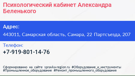 Психологический кабинет Александра Беленького по адресу 443011, Самарская область, Самара, 22 Партсъезда, 207 в дальнейшем Организация, размещена в следующих категориях: