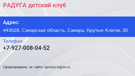 РАДУГА, детский клуб по адресу 443028, Самарская область, Самара, Крутые Ключи, 30 в дальнейшем Организация, размещена в следующих категориях:
