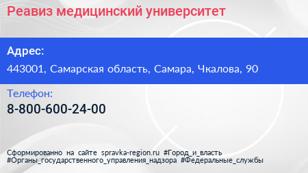 Реавиз, медицинский университет по адресу 443001, Самарская область, Самара, Чкалова, 90 в дальнейшем Организация, размещена в следующих категориях:
