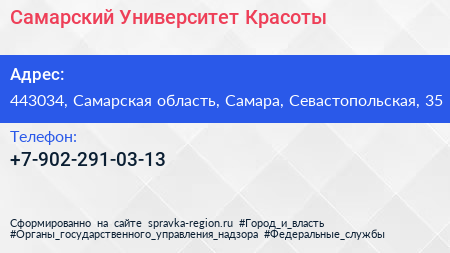 Самарский Университет Красоты по адресу 443034, Самарская область, Самара, Севастопольская, 35 в дальнейшем Организация, размещена в следующих категориях: