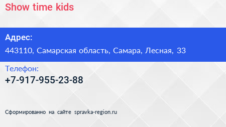 Show time kids по адресу 443110, Самарская область, Самара, Лесная, 33 в дальнейшем Организация, размещена в следующих категориях: