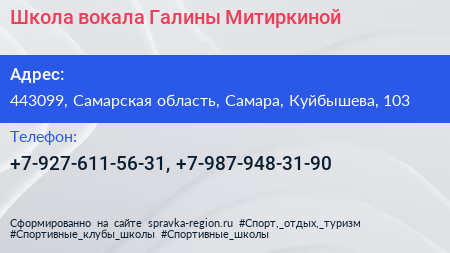 Школа вокала Галины Митиркиной по адресу 443099, Самарская область, Самара, Куйбышева, 103 в дальнейшем Организация, размещена в следующих категориях: