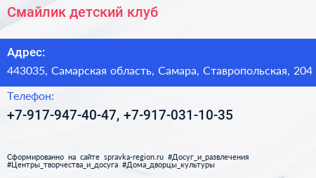 Смайлик, детский клуб по адресу 443035, Самарская область, Самара, Ставропольская, 204 в дальнейшем Организация, размещена в следующих категориях: