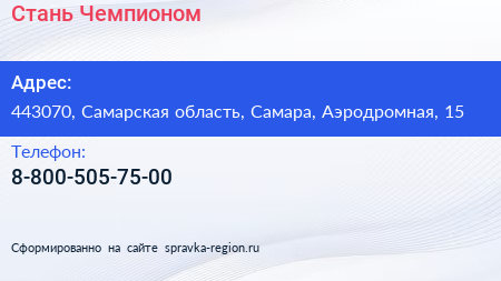 Стань Чемпионом по адресу 443070, Самарская область, Самара, Аэродромная, 15 в дальнейшем Организация, размещена в следующих категориях: