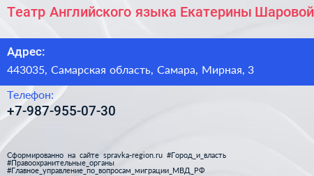 Театр Английского языка Екатерины Шаровой по адресу 443035, Самарская область, Самара, Мирная, 3 в дальнейшем Организация, размещена в следующих категориях: