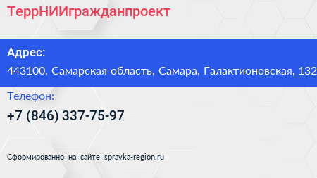 ТеррНИИгражданпроект по адресу 443100, Самарская область, Самара, Галактионовская, 132 в дальнейшем Организация, размещена в следующих категориях: