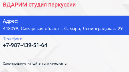 ВДАРИМ, студия перкуссии по адресу 443099, Самарская область, Самара, Ленинградская, 29 в дальнейшем Организация, размещена в следующих категориях: