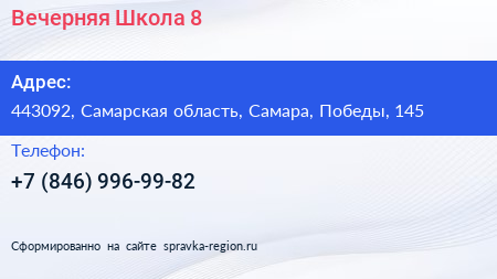 Вечерняя Школа №8 по адресу 443092, Самарская область, Самара, Победы, 145 в дальнейшем Организация, размещена в следующих категориях: