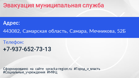 Эвакуация, муниципальная служба по адресу 443082, Самарская область, Самара, Мечникова, 52Б в дальнейшем Организация, размещена в следующих категориях: