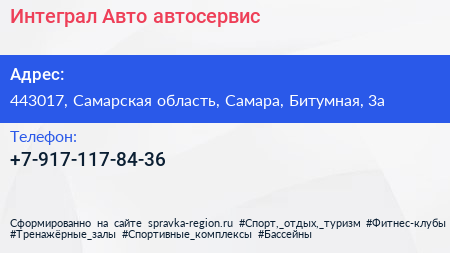 Интеграл Авто, автосервис по адресу 443017, Самарская область, Самара, Битумная, 3а в дальнейшем Организация, размещена в следующих категориях: