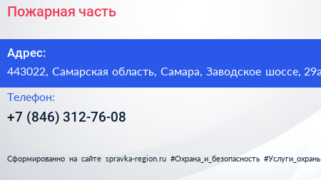 Пожарная часть по адресу 443022, Самарская область, Самара, Заводское шоссе, 29а в дальнейшем Организация, размещена в следующих категориях: