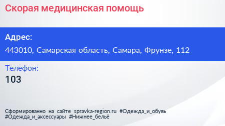 Скорая медицинская помощь по адресу 443010, Самарская область, Самара, Фрунзе, 112 в дальнейшем Организация, размещена в следующих категориях: