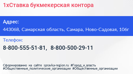 1xСтавка, букмекерская контора по адресу 443068, Самарская область, Самара, Ново-Садовая, 106г в дальнейшем Организация, размещена в следующих категориях: