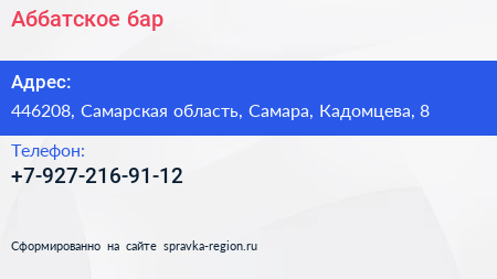 Аббатское, бар по адресу 446208, Самарская область, Самара, Кадомцева, 8 в дальнейшем Организация, размещена в следующих категориях: