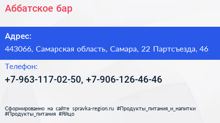 Аббатское, бар по адресу 443066, Самарская область, Самара, 22 Партсъезда, 46 в дальнейшем Организация, размещена в следующих категориях: