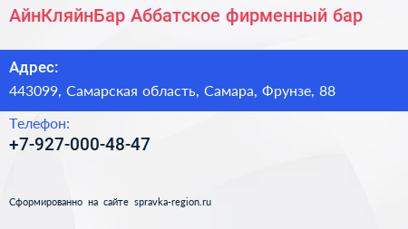АйнКляйнБар Аббатское, фирменный бар по адресу 443099, Самарская область, Самара, Фрунзе, 88 в дальнейшем Организация, размещена в следующих категориях: