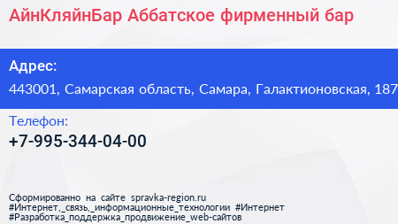 АйнКляйнБар Аббатское, фирменный бар по адресу 443001, Самарская область, Самара, Галактионовская, 187 в дальнейшем Организация, размещена в следующих категориях: