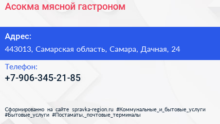 Асокма, мясной гастроном по адресу 443013, Самарская область, Самара, Дачная, 24 в дальнейшем Организация, размещена в следующих категориях: