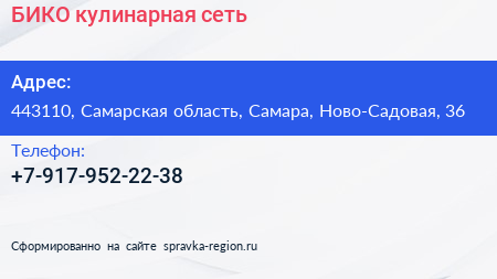 БИКО, кулинарная сеть по адресу 443110, Самарская область, Самара, Ново-Садовая, 36 в дальнейшем Организация, размещена в следующих категориях: