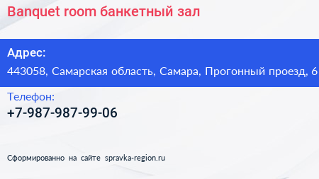 Banquet room, банкетный зал по адресу 443058, Самарская область, Самара, Прогонный проезд, 6 в дальнейшем Организация, размещена в следующих категориях: