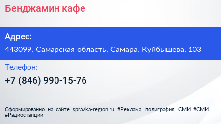 Бенджамин, кафе по адресу 443099, Самарская область, Самара, Куйбышева, 103 в дальнейшем Организация, размещена в следующих категориях:
