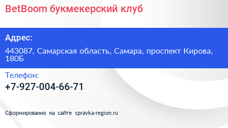BetBoom, букмекерский клуб по адресу 443087, Самарская область, Самара, проспект Кирова, 180Б в дальнейшем Организация, размещена в следующих категориях: