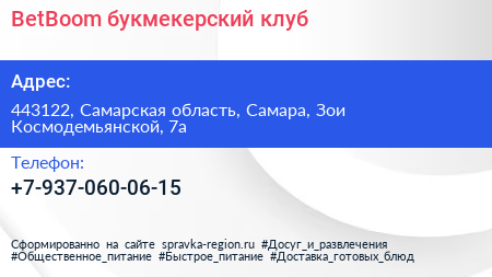 BetBoom, букмекерский клуб по адресу 443122, Самарская область, Самара, Зои Космодемьянской, 7а в дальнейшем Организация, размещена в следующих категориях: