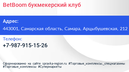 BetBoom, букмекерский клуб по адресу 443001, Самарская область, Самара, Арцыбушевская, 212 в дальнейшем Организация, размещена в следующих категориях: