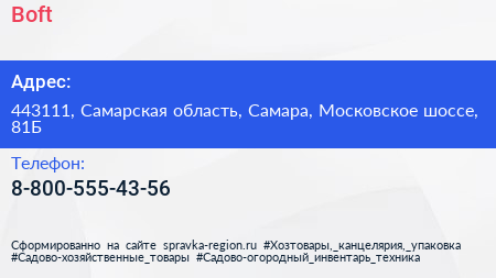 Boft по адресу 443111, Самарская область, Самара, Московское шоссе, 81Б в дальнейшем Организация, размещена в следующих категориях: