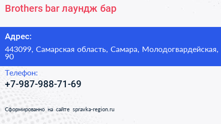 Brothers bar, лаундж-бар по адресу 443099, Самарская область, Самара, Молодогвардейская, 90 в дальнейшем Организация, размещена в следующих категориях: