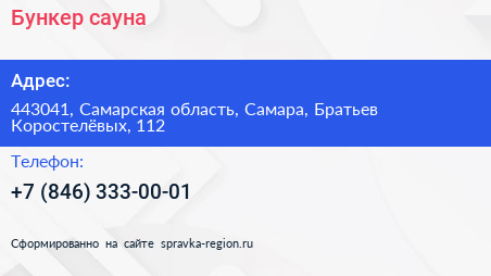 Бункер, сауна по адресу 443041, Самарская область, Самара, Братьев Коростелёвых, 112 в дальнейшем Организация, размещена в следующих категориях: