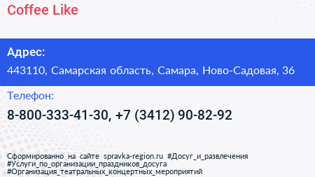 Coffee Like по адресу 443110, Самарская область, Самара, Ново-Садовая, 36 в дальнейшем Организация, размещена в следующих категориях: