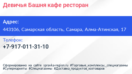 Девичья Башня, кафе-ресторан по адресу 443106, Самарская область, Самара, Алма-Атинская, 17 в дальнейшем Организация, размещена в следующих категориях: