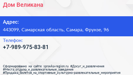 Дом Великана по адресу 443099, Самарская область, Самара, Фрунзе, 96 в дальнейшем Организация, размещена в следующих категориях: