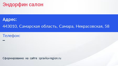 Эндорфин, салон по адресу 443010, Самарская область, Самара, Некрасовская, 58 в дальнейшем Организация, размещена в следующих категориях: