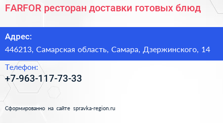 FARFOR, ресторан доставки готовых блюд по адресу 446213, Самарская область, Самара, Дзержинского, 14 в дальнейшем Организация, размещена в следующих категориях: