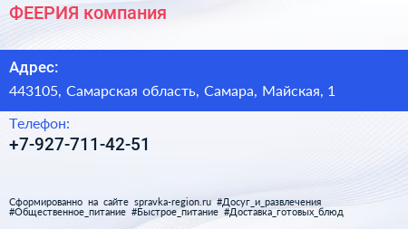 ФЕЕРИЯ, компания по адресу 443105, Самарская область, Самара, Майская, 1 в дальнейшем Организация, размещена в следующих категориях: