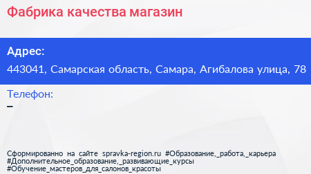 Фабрика качества, магазин по адресу 443041, Самарская область, Самара, Агибалова улица, 78 в дальнейшем Организация, размещена в следующих категориях: