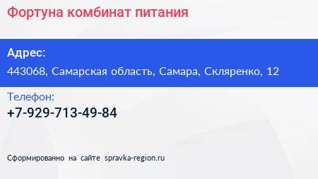 Фортуна, комбинат питания по адресу 443068, Самарская область, Самара, Скляренко, 12 в дальнейшем Организация, размещена в следующих категориях: