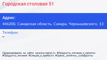Городская столовая №51 по адресу 446200, Самарская область, Самара, Чернышевского, 13 в дальнейшем Организация, размещена в следующих категориях: