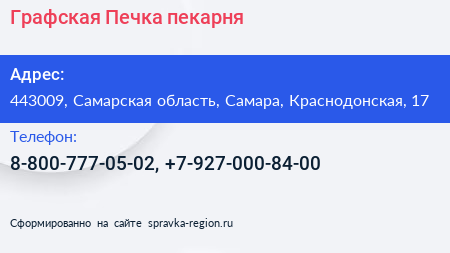 Графская Печка, пекарня по адресу 443009, Самарская область, Самара, Краснодонская, 17 в дальнейшем Организация, размещена в следующих категориях: