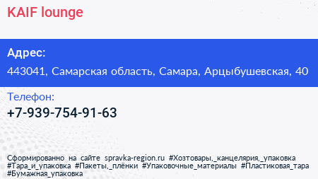 KAIF lounge по адресу 443041, Самарская область, Самара, Арцыбушевская, 40 в дальнейшем Организация, размещена в следующих категориях: