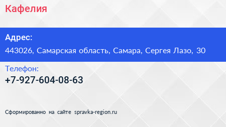 Кафелия по адресу 443026, Самарская область, Самара, Сергея Лазо, 30 в дальнейшем Организация, размещена в следующих категориях: