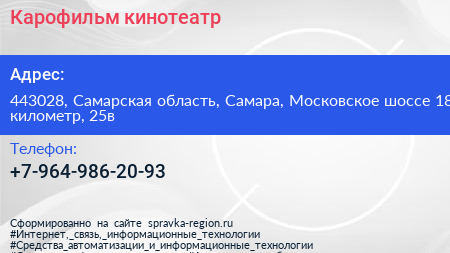 Карофильм, кинотеатр по адресу 443028, Самарская область, Самара, Московское шоссе 18 километр, 25в в дальнейшем Организация, размещена в следующих категориях: