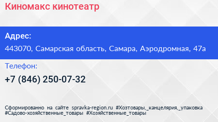 Киномакс, кинотеатр по адресу 443070, Самарская область, Самара, Аэродромная, 47а в дальнейшем Организация, размещена в следующих категориях: