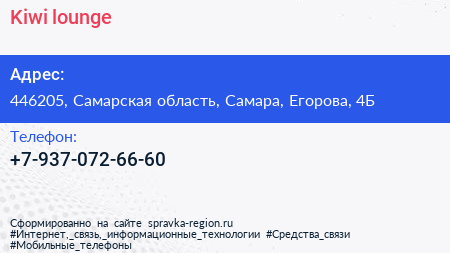 Kiwi lounge по адресу 446205, Самарская область, Самара, Егорова, 4Б в дальнейшем Организация, размещена в следующих категориях: