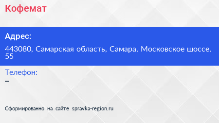 Кофемат по адресу 443080, Самарская область, Самара, Московское шоссе, 55 в дальнейшем Организация, размещена в следующих категориях: