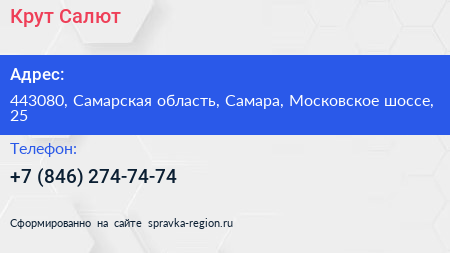 Крут Салют по адресу 443080, Самарская область, Самара, Московское шоссе, 25 в дальнейшем Организация, размещена в следующих категориях: