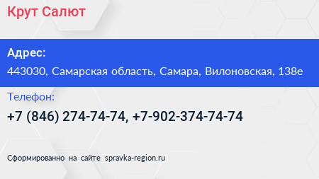 Крут Салют по адресу 443030, Самарская область, Самара, Вилоновская, 138е в дальнейшем Организация, размещена в следующих категориях: