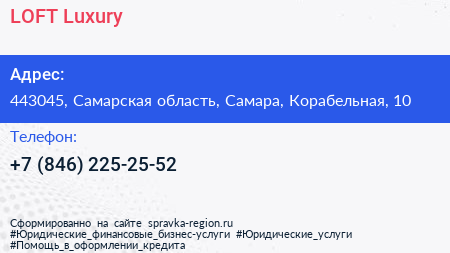 LOFT & Luxury по адресу 443045, Самарская область, Самара, Корабельная, 10 в дальнейшем Организация, размещена в следующих категориях: